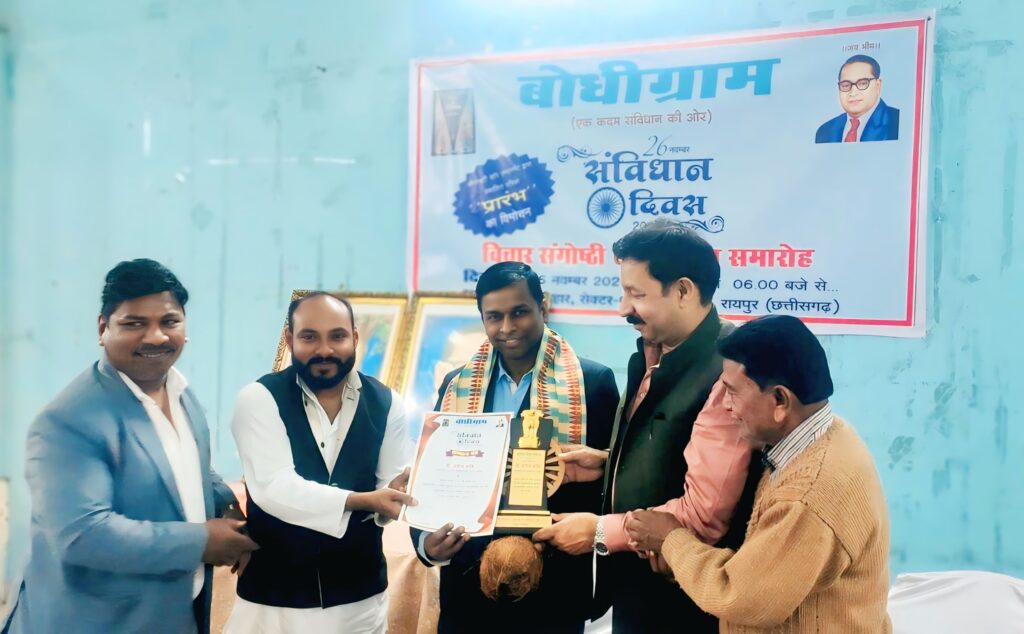 रायपुर | संविधान दिवस के अवसर पर बोधी ग्राम एक कदम संविधान की ओर संस्था द्वारा बौद्ध विहार, देवेंद्र नगर रायपुर में विचार गोष्ठी एवं सम्मान समारोह का आयोजन किया गया। कार्यक्रम में डॉ. रूपेन्द्र कवि को आदिमजाति एवं वंचित समुदायों के प्रति विशिष्ट योगदान, मानवशास्त्रीय शोध तथा मानव सेवा के लिए “राष्ट्रीय गौरव सम्मान–2025” से सम्मानित किया गया। उन्हें शॉल,श्रीफल, मोमेंटो एवं सम्मान पत्र प्रदान किए गए। समारोह में मुख्य अतिथि एडवोकेट सैयद फ़ैज़ल रिज़वी, विशेष अतिथि एडवोकेट आनंद मुर्गी तथा मुख्य वक्ता डॉ. रूपेन्द्र कवि उपस्थित रहे। कार्यक्रम की अध्यक्षता एवं संचालन संयोजक विजय राज बौध ने किया, जबकि आयोजन व्यवस्था में बौद्ध विहार के अध्यक्ष फुलझेरे जी का महत्वपूर्ण सहयोग रहा।
