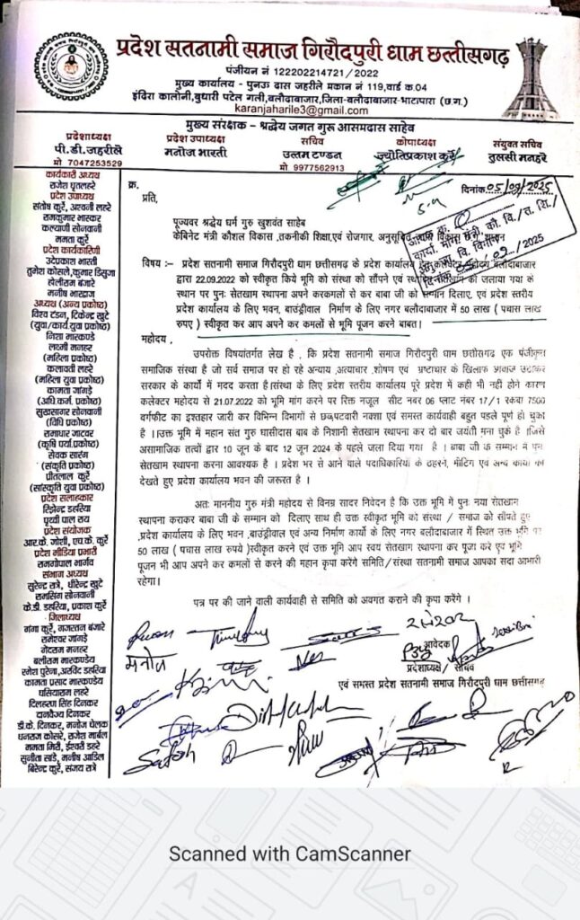 संस्था के लिए प्रदेश स्तरीय कार्यालय पूरे प्रदेश में कही भी नहीं होने कारण कलेक्टर से 21.07.2022 को भूमि मांग करने पर चिन्हांकित कराकर 22.09.2022 को स्वीकृत कर रिक्त नजूल भूमि सीट नंबर 06 प्लाट नंबर 17/1 रकबा 7500 वर्ग फीट का इश्तहार जारी कर विभिन्न विभागों से N O C,पटवारी नक्शा एवं समस्त कार्यवाही बहुत पहले पूर्ण हो चुका है। उक्त भूमि में महान संत गुरु घासीदास बाब के निशानी सेतखाम स्थापना कर दो बार जयंती मना चुके है।