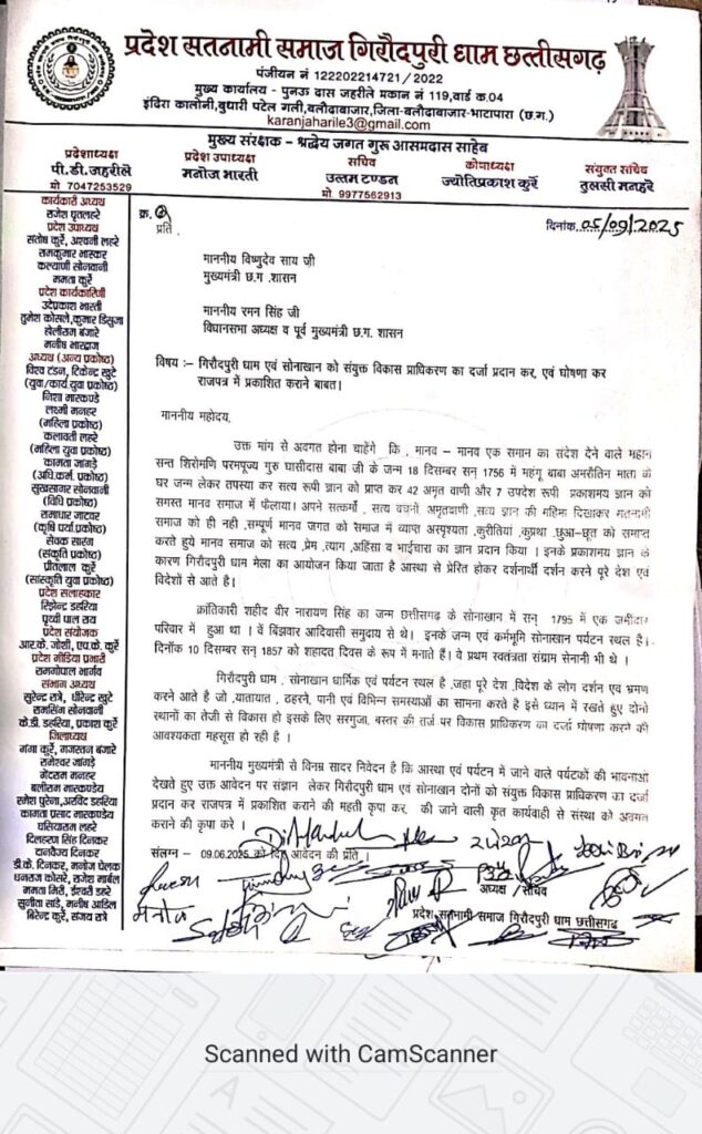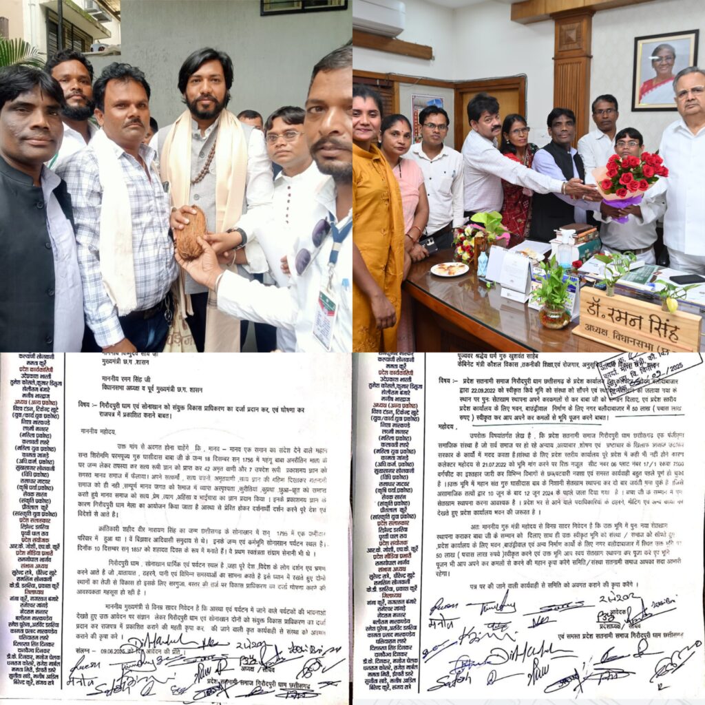 जिसे असामाजिक तत्वों द्वार 10 जून के बाद 12 जून 2024 के पहले जला दिया गया है। बाबा के सम्मान में पुनः सेतखाम स्थापना करना आवश्यक है। प्रदेश भर से आने वाले पदाधिकारियों के ठहरने, बैठक व्यवस्था हेतु एवं अन्य कार्यों को देखते हुए प्रदेश कार्यालय के लिये भवन की जरूरत है । श्रद्धेय गुरु मंत्री से आशीर्वाद लेकर निवेदन है कि उक्त भूमि में पुनः नया सेतखाम स्थापना कराकर बाबा के सम्मान को दिलाए साथ ही उक्त स्वीकृत भूमि को संस्था / समाज को सौंपते हुए,प्रदेश कार्यालय के लिए भवन,बाउं ड्रीवाल एवं अन्य निर्माण कार्यो के लिए नगर बलौदा बाजार में स्थित उक्त भूमि पर 50 लाख पचास लाख रुपये स्वीकृत करने एवं उक्त भूमि पर बाबा जी द्वारा दिये गये सत के निशानी सेतखाम का स्थापना कर पूजा करने निवेदन किया साथ ही उक्त भूमि पर राशि स्वीकृत कर भूमि पूजन करने मंत्री महोदय से निवेदन किया । इसके अतिरिक्त मुख्यमंत्री विष्णुदेव साय छ.ग.शासन को ज्ञापन एवं विधानसभा अध्यक्ष रमन सिंह से सौजन्य मुलाकात कर गिरौदपुरी धाम एवं सोनाखान को बस्तर विकास प्राधिकरण सरगुजा विकास प्राधिकरण एवं अन्य प्राधिकरण के तर्ज पर गिरौदपुरी धाम एवं सोनाखान संयुक्त विकास प्राधिकरण का दर्जा दिए जाने ज्ञापन देकर निवेदन किया गया।संस्था के प्रदेश अध्यक्ष पुनऊ दास जहरीले ने बताया कि दिनाँक -09.06.2025 को आवेदन देकर पूर्व में भी मांग को अवगत कराया कि महान संत गुरु घासीदास बाबा की तपो भूमि गिरौदपुरी धाम एवं क्रांतिकारी शहीद वीर नारायण सिंह की कर्म भूमि दोनों ही स्थान विश्व स्तरीय धार्मिक और पर्यटन स्थल है विकास प्राधिकरण का दर्जा दिए जाने से दोनों ही स्थानों का तेजी से विकास होगा।विशेष रूप से प्रदेश अध्यक्ष पी. डी.जहरीले, प्रदेश सचिव उत्तम टंडन, उपाध्यक्ष संतोष कुर्रे,मनोज भारती,कार्यकारी अध्यक्ष राजेश घृतलहरे, प्रदेश कोषाध्यक्ष ज्योति प्रकाश कुर्रे, संयुक्त सचिव तुलसी मनहरे, प्रदेश कार्य कारणीय सदस्य कुमार डिसूजा,देवेंद्र गहरवार, प्रदेश अध्यक्ष महिला लक्ष्मी बाई, निशा मार्कण्डेय,कार्यकारी प्रदेश अध्यक्ष यूथ टिकेंद्र खूटे, प्रीतलाल कुर्रे प्रदेश अध्यक्ष संस्कृति प्रकोष्ठ,रायपुर जिला अध्यक्ष भूखन कुर्रे,संभाग अध्यक्ष कुंवर सिंह डहरिया, जिला अध्यक्ष लक्ष्मी डहरिया, जिला उपाध्यक्ष संतोष नवरंगे ,ब्लाक अध्यक्ष रोहित रत्नाकर,उपाध्यक्ष,जनऊ गर्ग, राजेश्वर बंजारे,दीप्ति खांन्डेकर, विनोद गायकवाड़,धर्मेंद्र, प्रदेश मीडिया प्रभारी राम गोपाल भार्गव एवं अन्य सामाजिक कार्यकर्ता उपस्थित थे। उक्त प्रेस विज्ञप्ति प्रदेश सचिव उत्तम टण्डन ने जारी की।