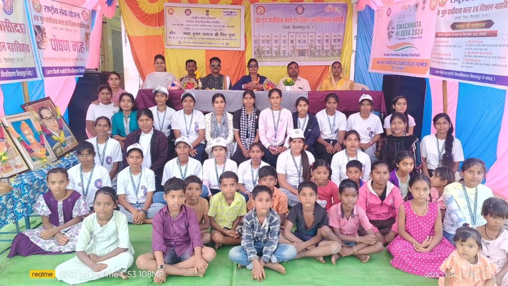आयोजक संत गुरु घासीदास कला एवं विज्ञान महाविद्यालय, पचपेड़ी संबद्ध अटल बिहारी वाजपेयीविश्वविद्यालय,बिलासपुर (छत्तीसगढ़)दिनांक : 24 नवम्बर 2025 से 30 नवम्बर 2025 शिविर के प्रथम दिवस का शुभारंभ संत गुरु घासीदास कला एवं विज्ञान महाविद्यालय, पचपेड़ी द्वारा आयोजित राष्ट्रीय सेवा योजना (NSS) के सात दिवसीय विशेष शिविर “नशा मुक्त समाज के लिए युवा” का शुभारंभ 24 नवम्बर 2025 को जनपद शासकीय प्राथमिक शाला,मनवा में किया गया। शिविर का उद्घाटन मुख्य अतिथि धनेश कुमार भार्गव सरपंच ग्राम पंचायत मनवा द्वारा किया गया। विशिष्ट अतिथि श्रीमती सावित्री बंजारे प्रधान पाठक,जनपद शासकीय प्राथमिक शाला मनवा रहीं। अन्य अतिथियों में श्री राम, त्रिभुवन पोर्ते रोजगार सहायक, जीवन टंडन उपसरपंच मनवा तथा मुकेश यादव पंच विशेष रूप से उपस्थित रहे। ग्रामवासी एवं सभी स्वयंसेवकों ने कार्यक्रम में उत्साहपूर्वक भाग लिया। बौद्धिक सत्र सामाजिक विकास हेतु शिक्षा का महत्व