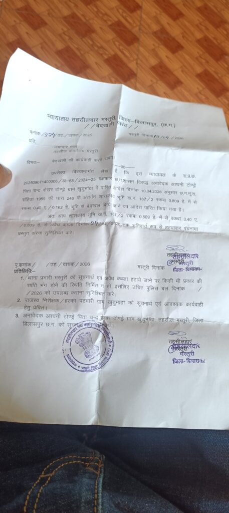 मामला खसरा नंबर 187/2, रकबा 0.809 हेक्टेयर में से 0.40 एकड़ भूमि का है, जिस पर कब्जाधारी अश्वनी टोण्ट्रे के खिलाफ छत्तीसगढ़ भू-राजस्व संहिता 1959 की धारा 248 के तहत तहसील न्यायालय द्वारा 10 अप्रैल 2026 को बेदखली का आदेश पारित किया गया था। आदेश के अनुसार कब्जाधारी को 24 अप्रैल 2026 तक स्वयं अवैध कब्जा हटाकर पंचनामा प्रस्तुत करने का समय दिया गया था।