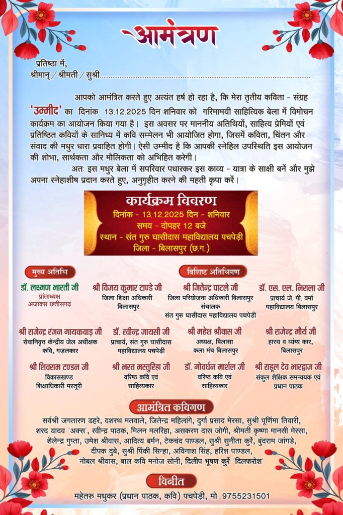 Home/Blog/महेतरु मधुकर की ‘उम्मीद’ कविता संग्रह का विमोचन व भव्य कवि सम्मेलन का आयोजन 13 दिसंबर को संत गुरु घासीदास महाविद्यालय पचपेड़ी में Blog महेतरु मधुकर की ‘उम्मीद’ कविता संग्रह का विमोचन व भव्य कवि सम्मेलन का आयोजन 13 दिसंबर को संत गुरु घासीदास महाविद्यालय पचपेड़ी में Ramgopal Bhargav11 December 20250 93 Less than a minute Facebook X LinkedIn WhatsApp Telegram Ramgopal Bhargav11 December 20250 93 Less than a minute Facebook X LinkedIn WhatsApp Telegram Share Facebook X LinkedIn WhatsApp Telegram Share via Email Print