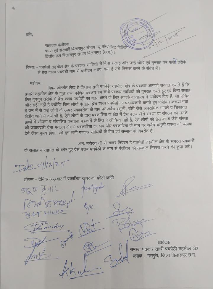 प्रेस क्लब पचपेड़ी के गठन पर मस्तूरी प्रेस क्लब के सदस्यों ने भी सहायक संचालक बिलासपुर एवं जिला कलेक्टर से पांच बिंदु में शिकायत किया था,और पहले ही अवगत कराया है की