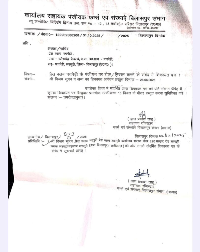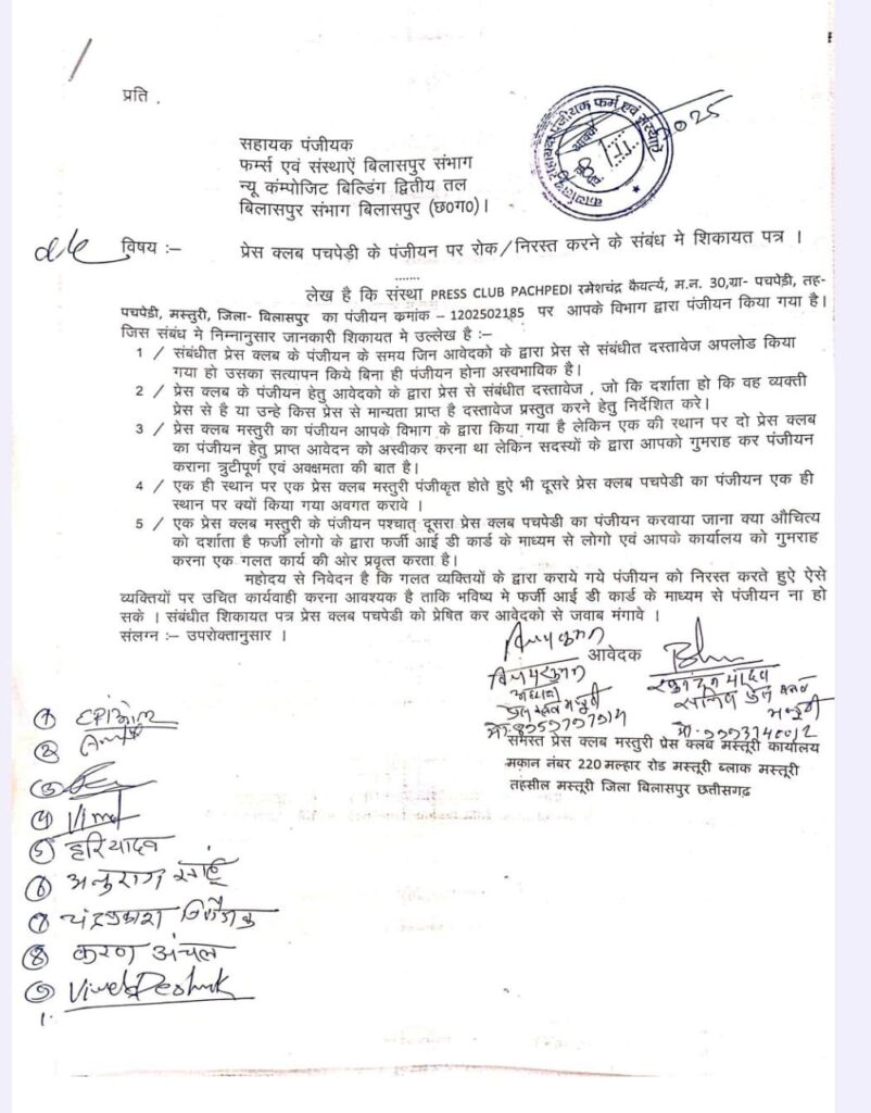 प्रेस क्लब मस्तुरी का पंजीयन आपके विभाग के द्वारा किया गया है लेकिन एक ही क्षेत्र स्थान पर दो प्रेस क्लब का पंजीयन हेतु प्राप्त आवेदन को अस्वीकर करना था, लेकिन सदस्यों के द्वारा आपको गुमराह कर पंजीयन कराना त्रुटीपूर्ण एवं अक्क्षमता की बात है।साथ ही एक ही स्थान पर एक प्रेस क्लब मस्तुरी पंजीकृत होते हुऐ भी दूसरे प्रेस क्लब पचपेड़ी का पंजीयन एक ही स्थान पर क्यों किया गया अवगत कराने व एक प्रेस क्लब मस्तूरी के पंजीयन पश्चात् दूसरा प्रेस क्लब पचपेड़ी का पंजीयन करवाया जाना क्या औचित्य को दर्शाता है, फर्जी लोगो के द्वारा फर्जी आई डी कार्ड दिखाकर लोगों एवं आपके कार्यालय को गुमराह करने का कार्य करने जैसे मामलों को लेकर शिकायत दर्ज कराई थी।