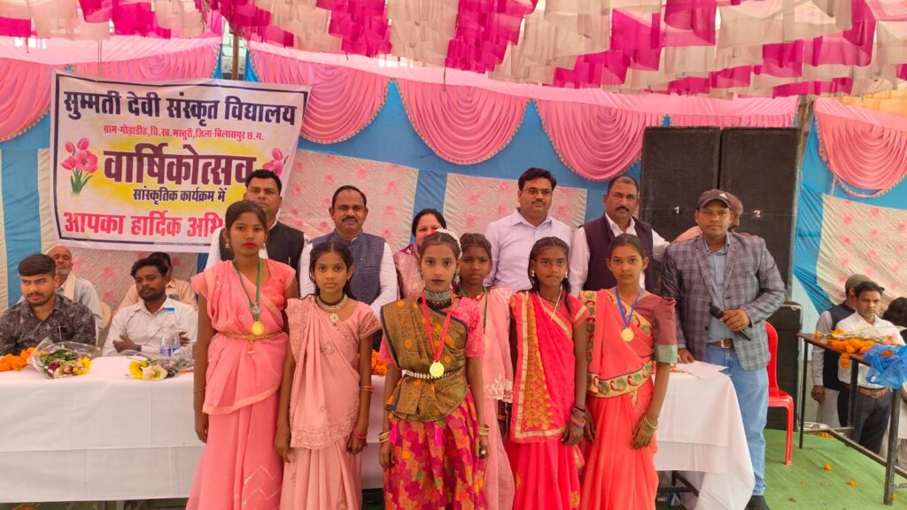 बिलासपुर। मस्तुरी क्षेत्र के गोड़ाडीह में सुम्मती देवी संस्कृत विद्यालय में प्रति वर्ष के भाती इस वर्ष भी छात्र छात्राओं द्वारा कला के क्षेत्र में अपनी अपनी कलाओं को प्रदर्शित करने का अवसर वार्षिक उत्सव में ही देखने को मिलता है इस कार्यक्रम मे स्कूली बच्चों द्वारा सांस्कृतिक, कला पर भारी बढ़ चढ़कर हिस्सा लिया गया , खेल कूद, पत्र लेखन सहित अन्य विषयों पर छात्र छात्राओं को सम्मानित किया गया ।