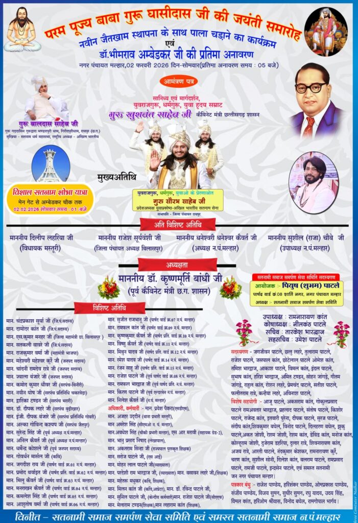 बिलासपुर। मल्हार।परम पूज्य बाबा गुरु घासीदास की जयंती के अवसर पर नगर पंचायत मल्हार में भव्य समारोह का आयोजन किया जा रहा है। कार्यक्रम के अंतर्गत नवीन जय स्तंभ स्थापना, पाला चढ़ाने का कार्यक्रम एवं भारत रत्न डॉ. भीमराव अम्बेडकर की प्रतिमा का अनावरण किया जाएगा। यह आयोजन 02 फरवरी 2026, दिन सोमवार को नगर पंचायत मल्हार में संपन्न होगा।