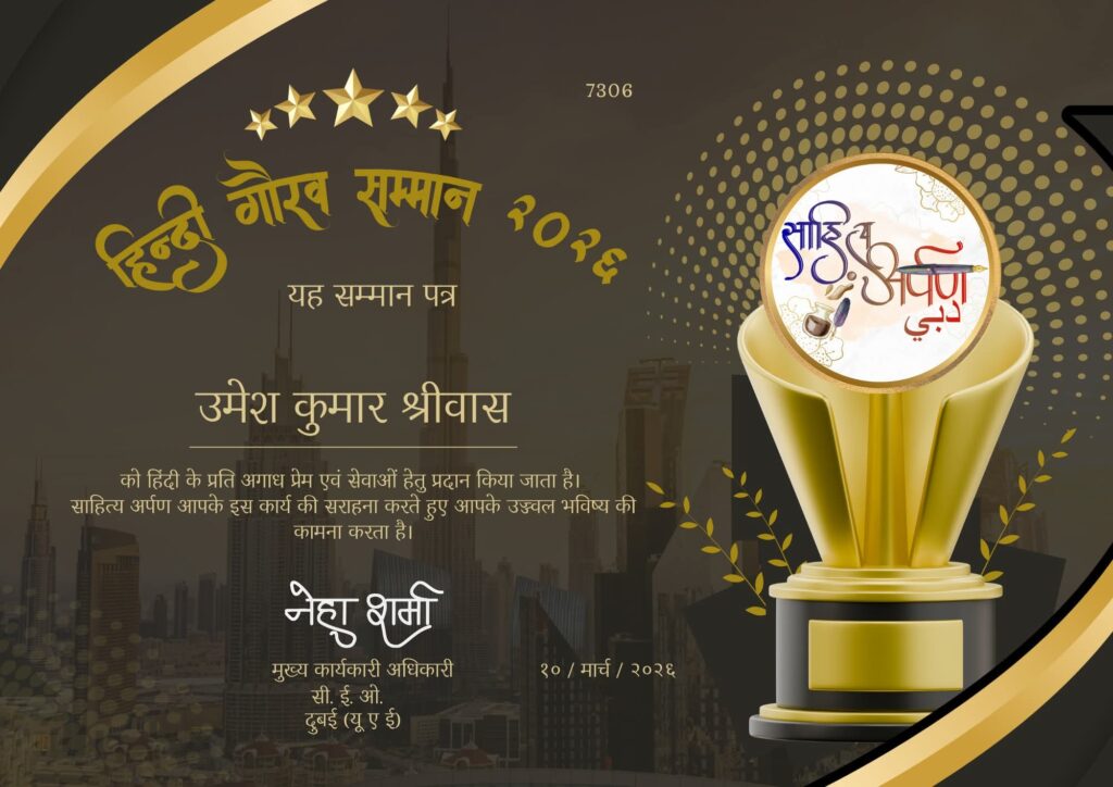 बिलासपुर। हिन्दी केवल भाषा नहीं, बल्कि भारतीय आत्मा की अभिव्यक्ति है—और इसी आत्मा को अपने शब्दों में साकार करने वाले कवि, लेखक व साहित्यकार उमेश कुमार श्रीवास, मु. पो. खैरा जयरामनगर, तहसील मस्तूरी, जिला बिलासपुर (छत्तीसगढ़) को वर्ष 2026 का प्रतिष्ठित “हिन्दी गौरव सम्मान” प्रदान कर गौरवान्वित किया गया।